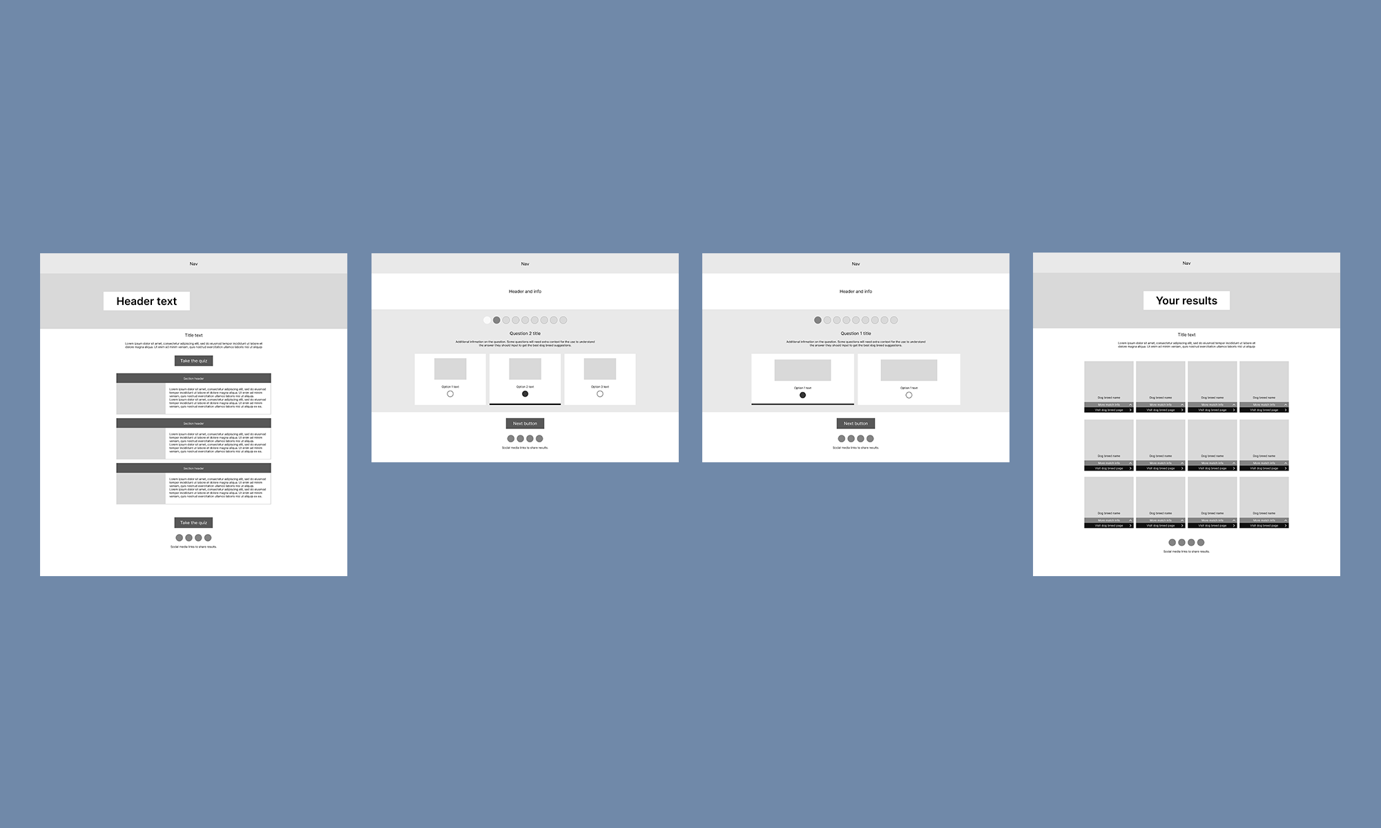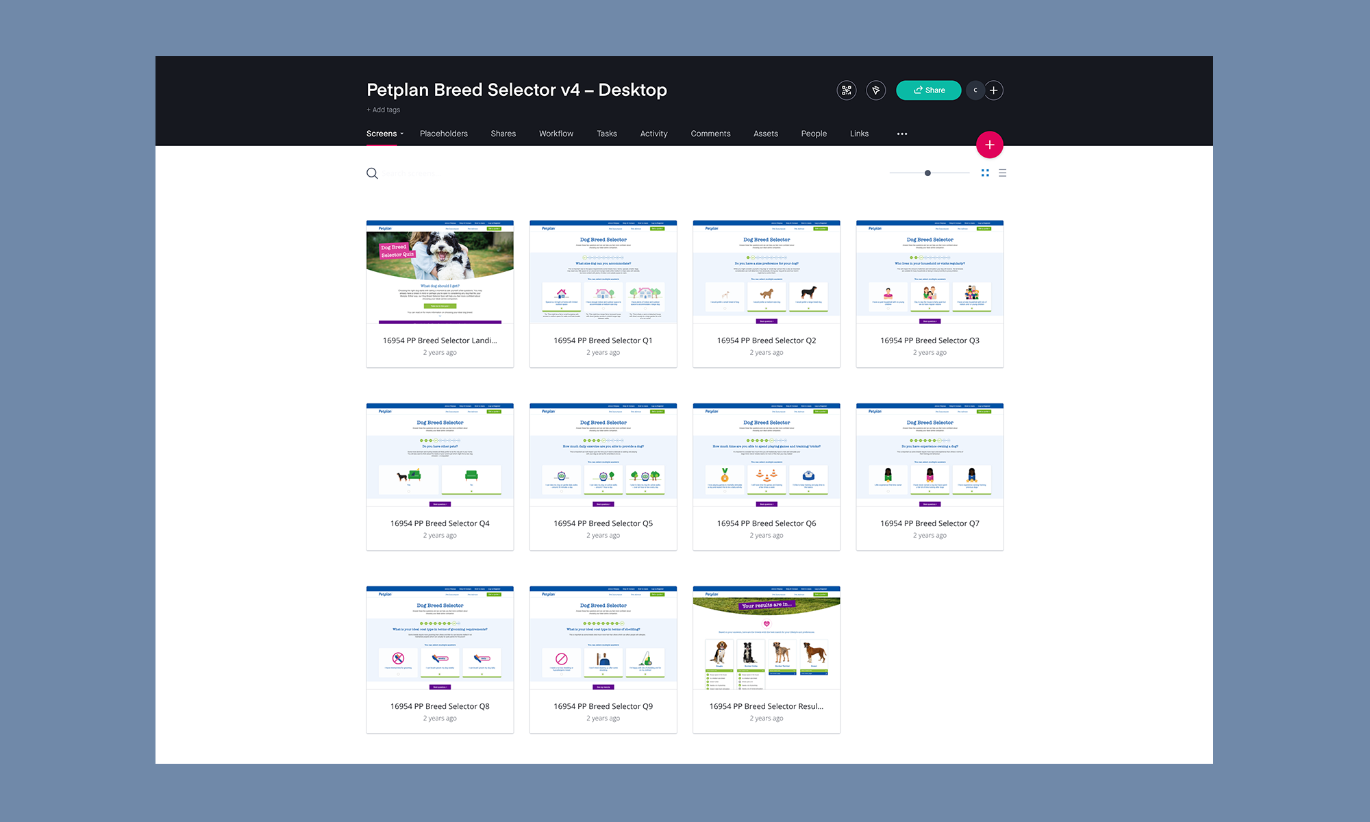 Using prior research, Petplan already had a good scope on the questions asked to ascertain a users ideal dog breeds. Therefore, my initial task was to put the information into wireframes showing the simple screen layouts and user journeys.